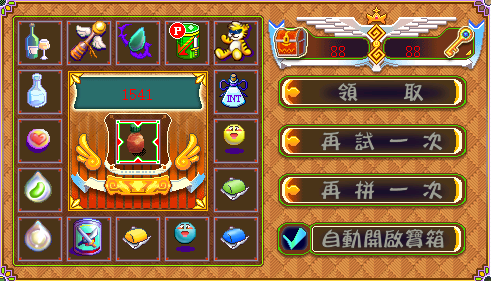 獎池如下:武器降級塗料、防具降級塗料、白銀種子、黃金種子、鑽石種子、珍珠種子、翡翠種子、寵物親親糖、寵物甜心糖、白銀軟糖、黃金軟糖、鑽石軟糖、珍珠軟糖、翡翠軟糖、紅寶石軟糖、藍寶石軟糖、玻璃軟糖、10魔幣、力量調整藥丸、體質調整藥丸、敏捷調整藥丸、智慧調整藥丸、幸運調整藥丸、魅力調整藥丸、高級武器降級塗料、高級防具降級塗料、孤獨超能幻獸加油棒、超級經驗娃娃、力量調整藥劑、體質調整藥劑、敏捷調整藥劑、智慧調整藥劑、幸運調整藥劑、魅力調整藥劑、強化玻璃軟糖、五級封印石、笨牛鑰匙、武器防爆降級涂料、防具防爆降級涂料、神秘豆子、元素豆子、靈魂豆子、神秘OK繃、強化玻璃軟糖包、七級封印石、三級封印壺、玻璃種子、耐用穩定劑、超能幻獸加油棒、再造玻璃軟糖、秘能豆子、50魔幣、100魔力包、生命核心、宇宙奧秘、分子穩定劑、500魔幣、寵物降級香檳、寵物降級開水、力量搗蛋藥丸、體質搗蛋藥丸、敏捷搗蛋藥丸、智慧搗蛋藥丸、幸運搗蛋藥丸、魅力搗蛋藥丸、屬性調整藥丸、屬性搗蛋藥丸、一級封印壺、二級封印壺、暗儀魔瓶(300耐)、暗儀魔瓶(3000耐)、暗儀魔瓶(10000耐);