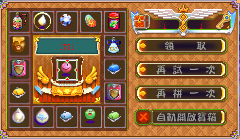 獎池如下:武器降級塗料、防具降級塗料、白銀種子、黃金種子、鑽石種子、珍珠種子、翡翠種子、寵物親親糖、寵物甜心糖、白銀軟糖、黃金軟糖、鑽石軟糖、珍珠軟糖、翡翠軟糖、紅寶石軟糖、藍寶石軟糖、玻璃軟糖、10魔幣、力量調整藥丸、體質調整藥丸、敏捷調整藥丸、智慧調整藥丸、幸運調整藥丸、魅力調整藥丸、高級武器降級塗料、高級防具降級塗料、孤獨超能幻獸加油棒、超級經驗娃娃、力量調整藥劑、體質調整藥劑、敏捷調整藥劑、智慧調整藥劑、幸運調整藥劑、魅力調整藥劑、強化玻璃軟糖、五級封印石、笨牛鑰匙、武器防爆降級涂料、防具防爆降級涂料、神秘豆子、元素豆子、靈魂豆子、神秘OK繃、強化玻璃軟糖包、七級封印石、三級封印壺、玻璃種子、耐用穩定劑、超能幻獸加油棒、再造玻璃軟糖、秘能豆子、50魔幣、100魔力包、生命核心、宇宙奧秘、分子穩定劑、500魔幣、寵物降級香檳、力量搗蛋藥丸、體質搗蛋藥丸、敏捷搗蛋藥丸、智慧搗蛋藥丸、幸運搗蛋藥丸、魅力搗蛋藥丸、屬性調整藥丸、屬性搗蛋藥丸、一級封印壺、二級封印壺、暗儀魔瓶(300耐)、暗儀魔瓶(3000耐)、暗儀魔瓶(10000耐)、寵物降級雞精;