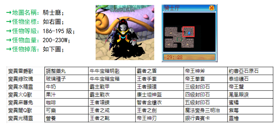 5、特殊地圖:“騎士廳”,為計費計時地圖,需購買【[騎士廳]入場券】,通過吉恩村水池旁NPC[ 騎士廳接待員 ]進入地圖,可通過[ 傳送粉末、婚戒傳送、死亡、計時到期 ]出該地圖,此地圖初步設計為【測試地圖】,後續會根據實際情況,進行調整“地圖、怪物屬性、掉落”等,也會進行地圖升級、分區等!!!